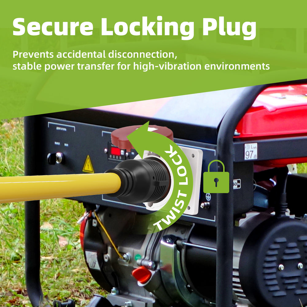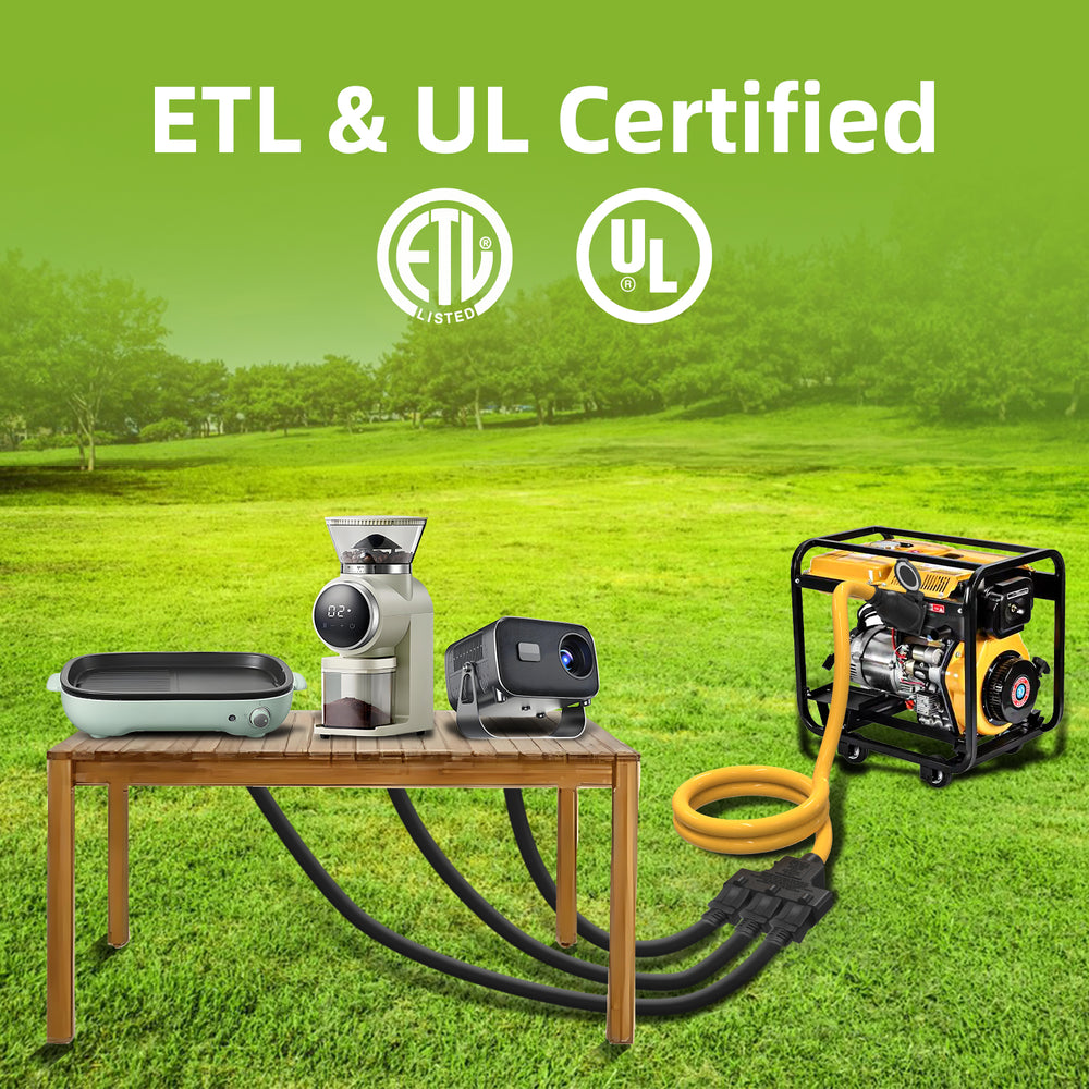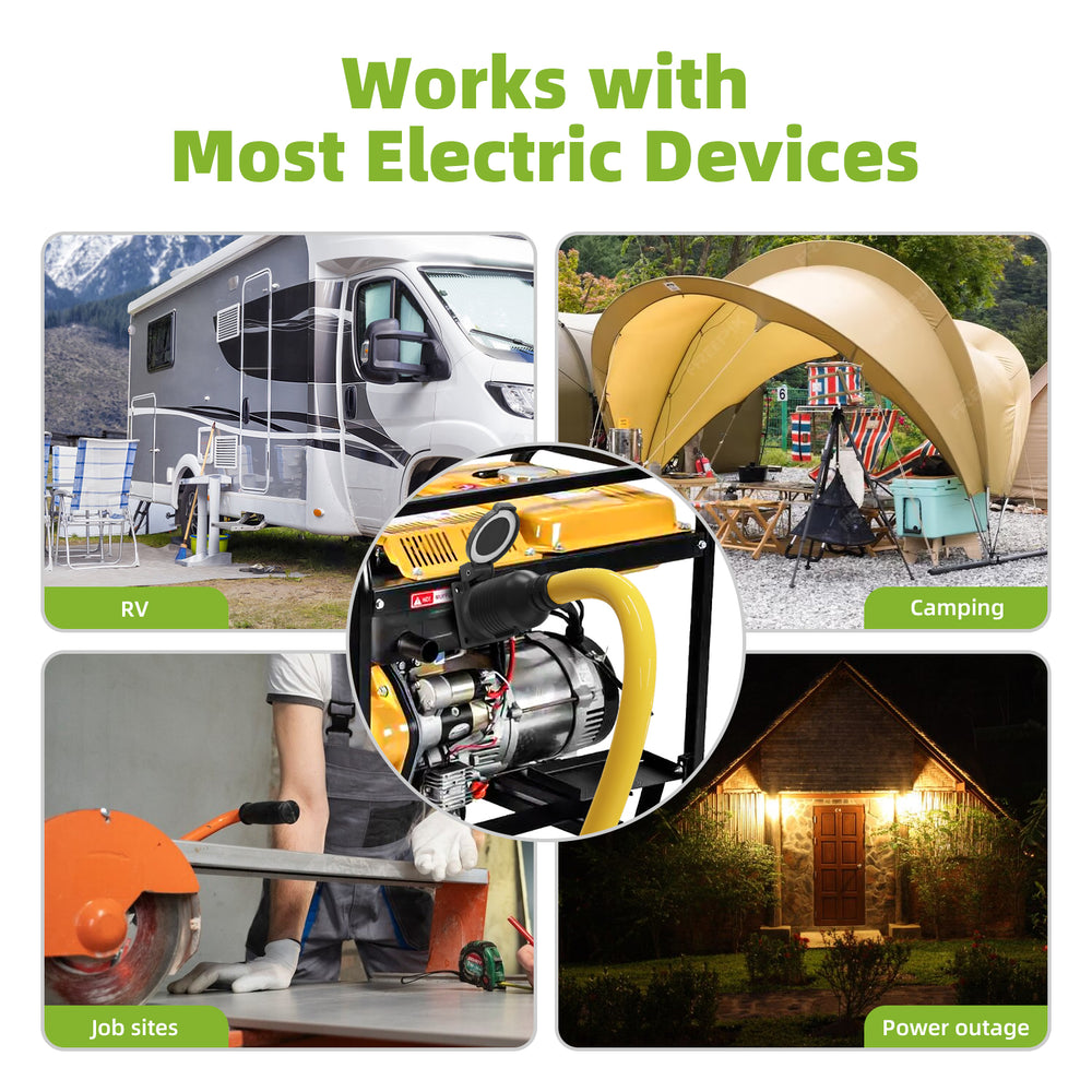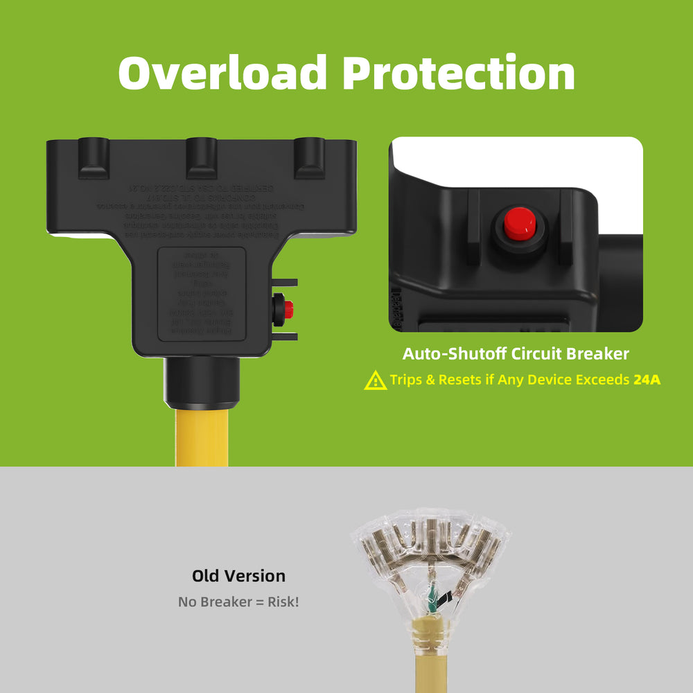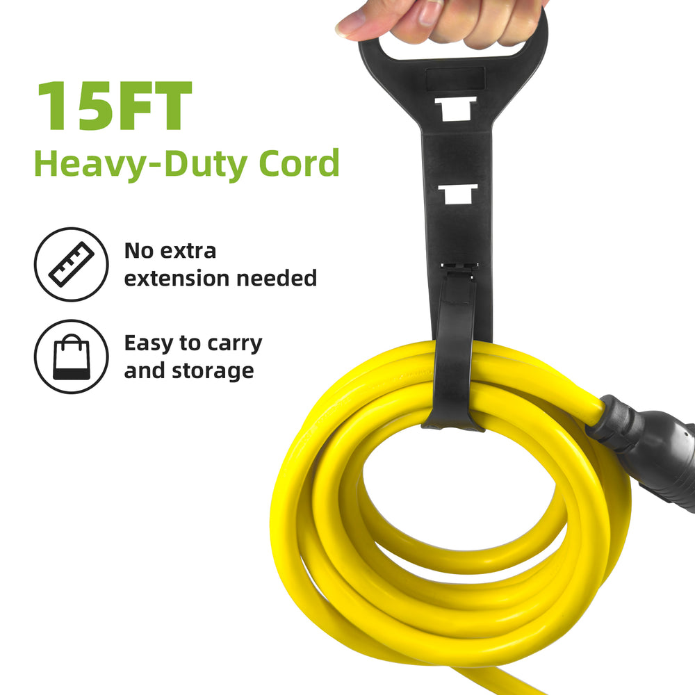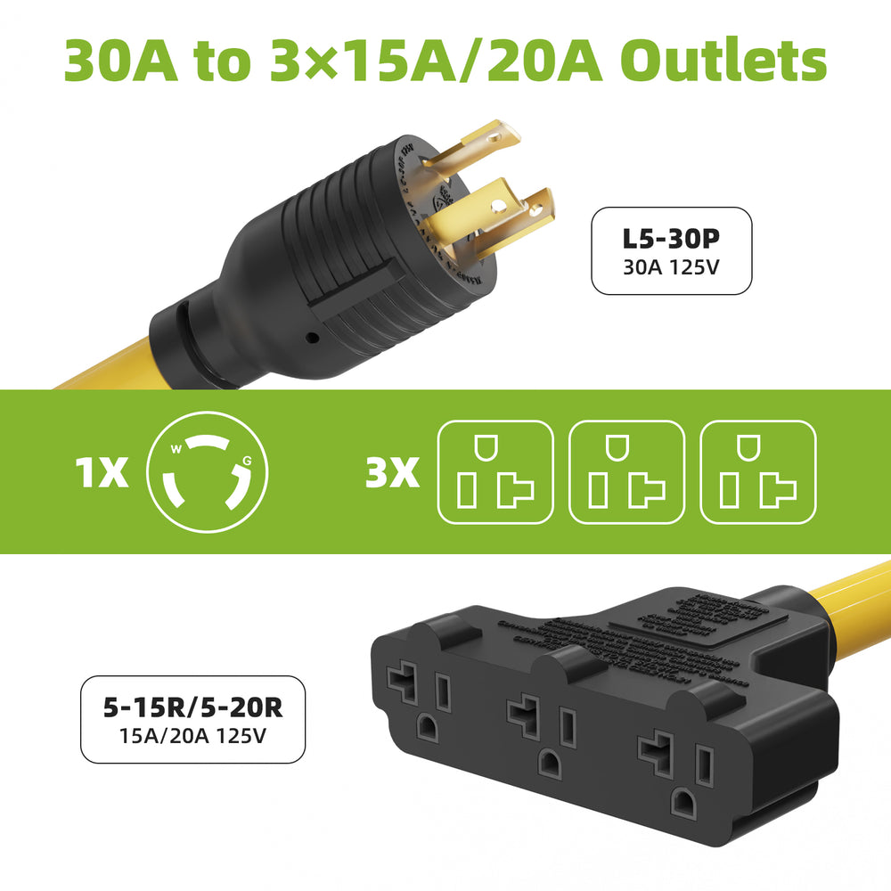 The 15FT NEMA L5-30P to 3× 5-15/20R Generator Adapter Cord is a reliable and versatile solution for RV owners, campers, and homeowners needing to safely convert a 30 Amp generator outlet into standard 15/20 Amp household outlets. Equipped with built-in 20A circuit breakers and ETL-listed components, this heavy-duty adapter ensures safe and consistent power distribution. Its 10 AWG pure copper wires and flame-retardant SJTW jacket provide durability for both indoor and outdoor use.
