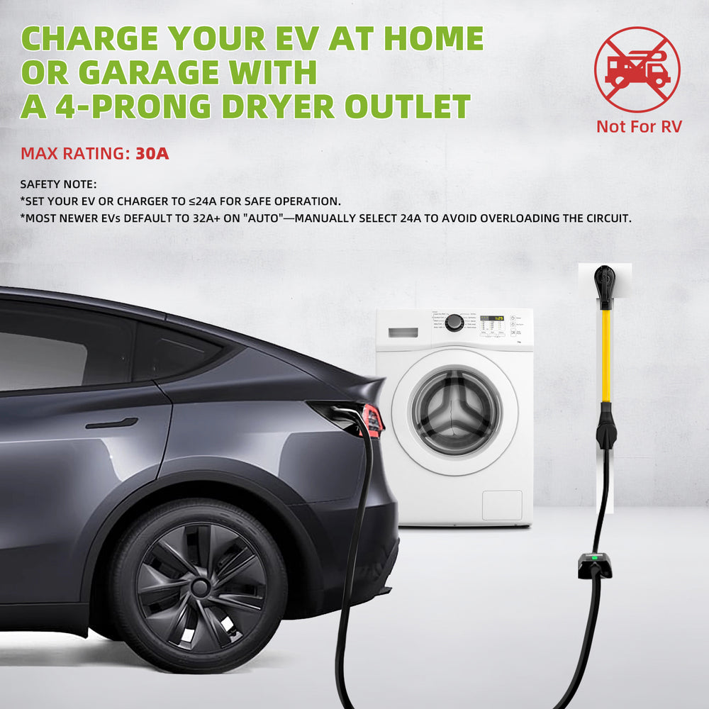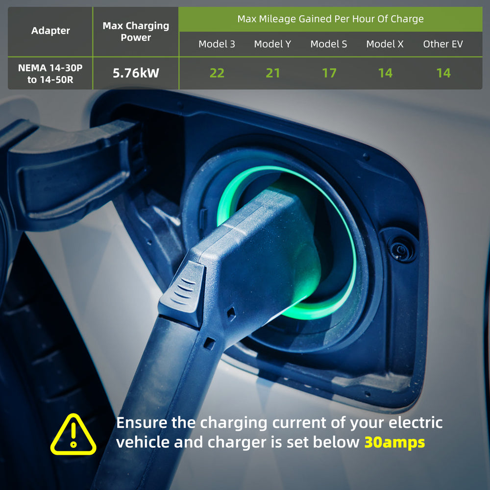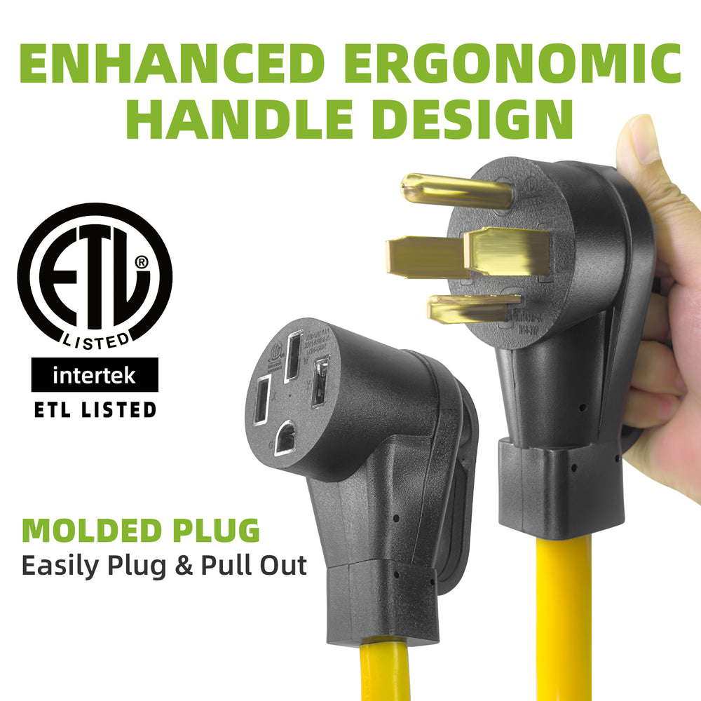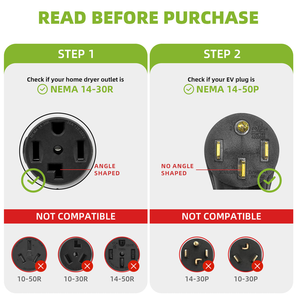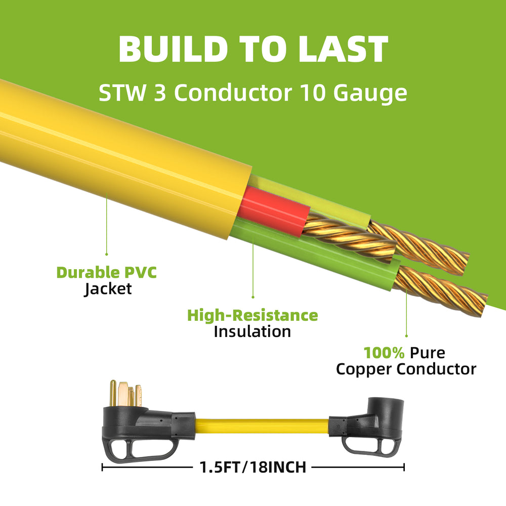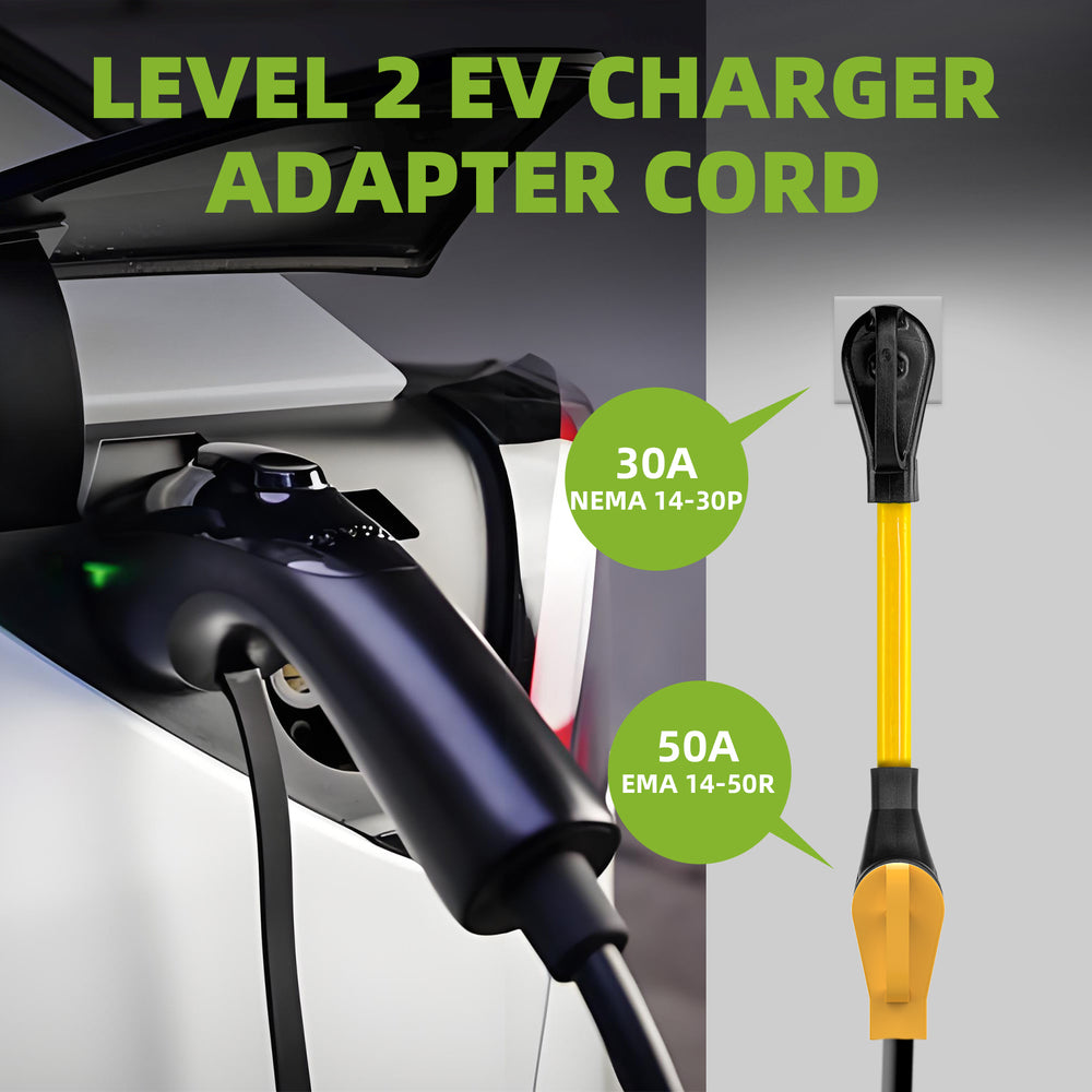The NEMA 14-30P to 14-50R EV Charger Adapter Cord is a safe and reliable solution for EV owners who need to charge from a 30 Amp dryer outlet. It seamlessly converts a 30A 4-prong dryer plug (NEMA 14-30P) into a 50A EV charging receptacle (NEMA 14-50R), making it perfect for home garages, RV users, or temporary charging setups. Built with heavy-duty 10 AWG copper wire, a flame-retardant PVC jacket, and ETL certification, this adapter ensures durability, conductivity, and safety. Its compact 1.5-foot length provides flexibility without clutter, ideal for both indoor and outdoor use.