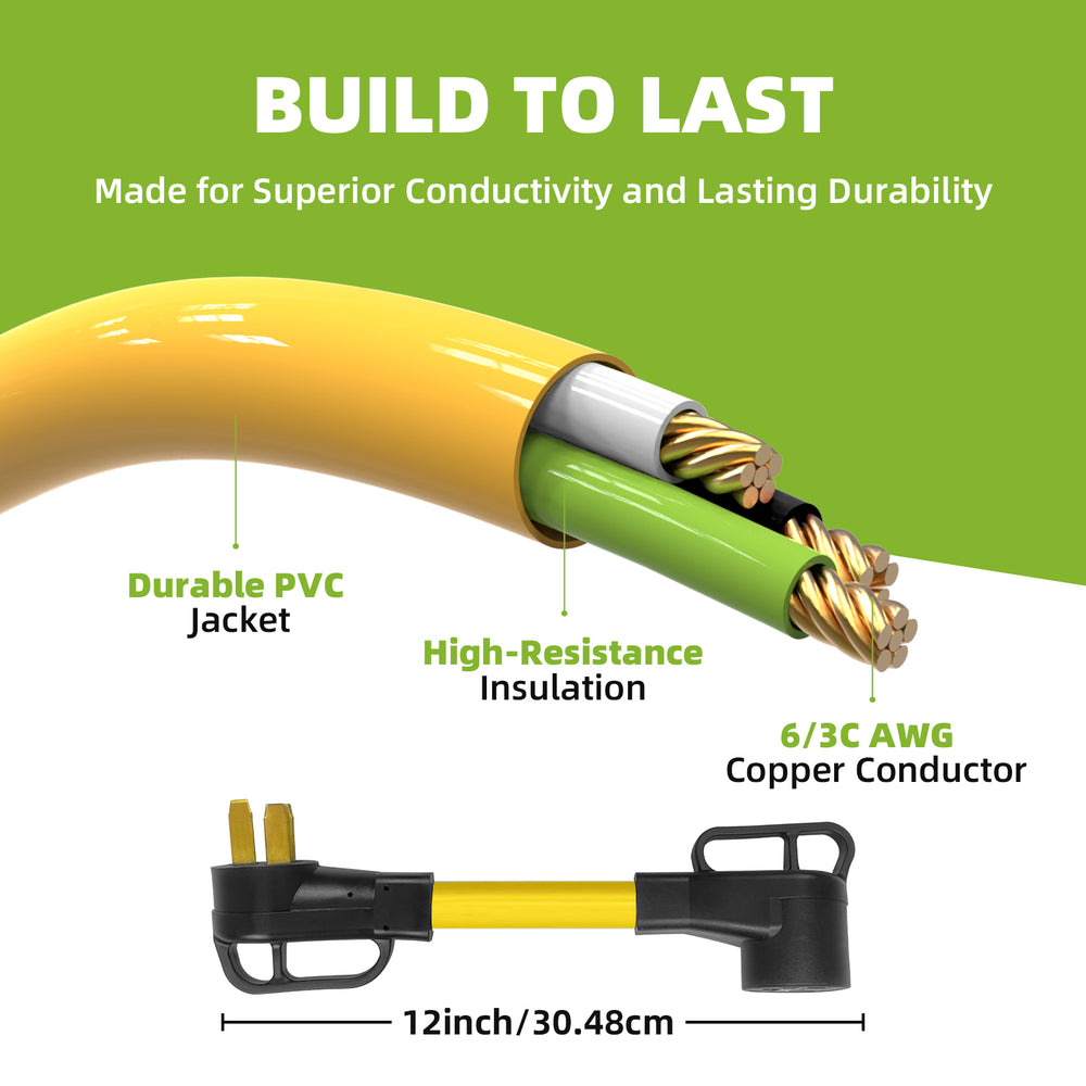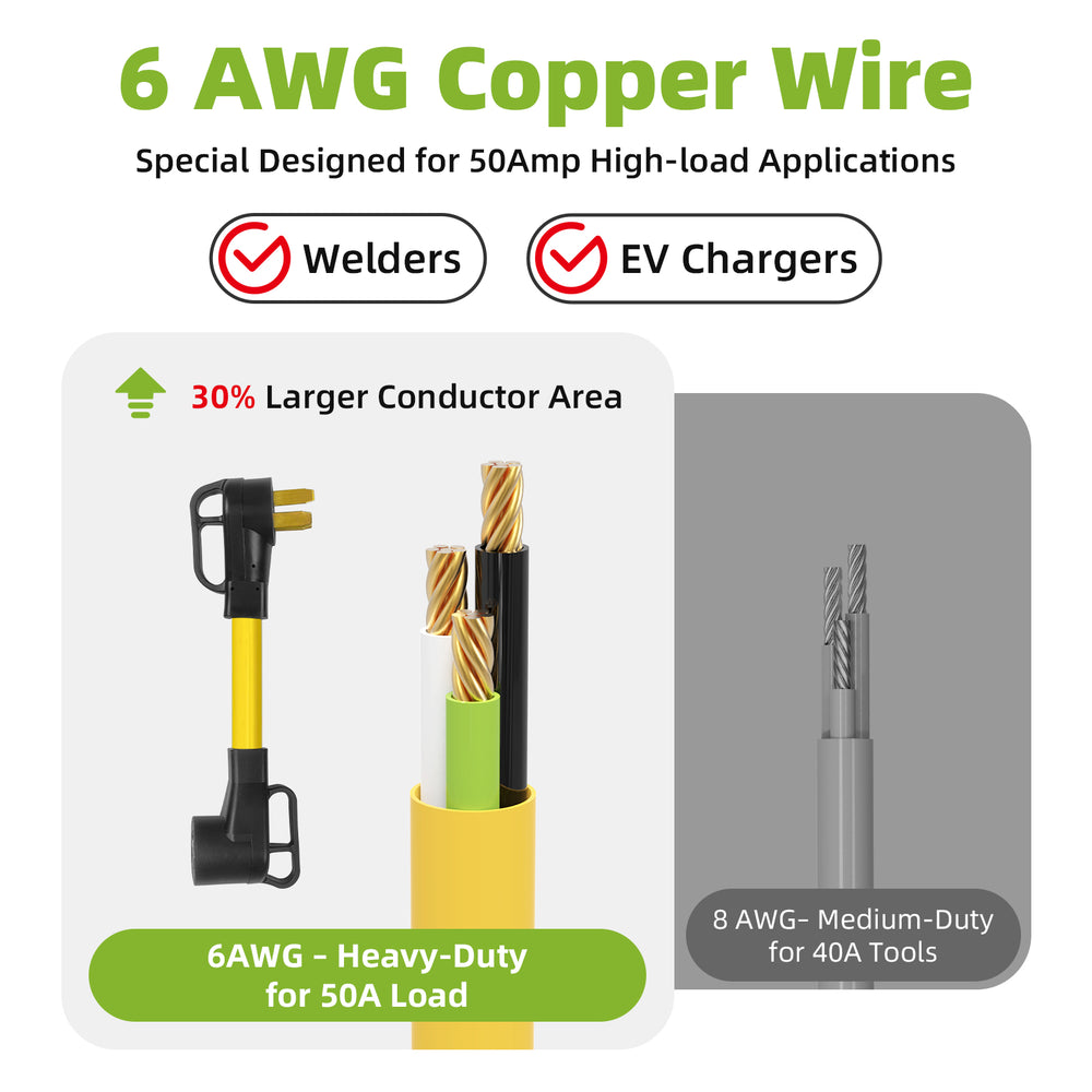 This 50A welder adapter cord is designed to safely connect modern welding machines, plasma cutters, or EV chargers to older NEMA 10-50 stove or range outlets. Built with 100% 6 AWG pure copper wiring and a heavy-duty STW jacket, it supports stable 250V high-power loads up to 12,500W. Ideal for garages, workshops, and home EV charging setups.